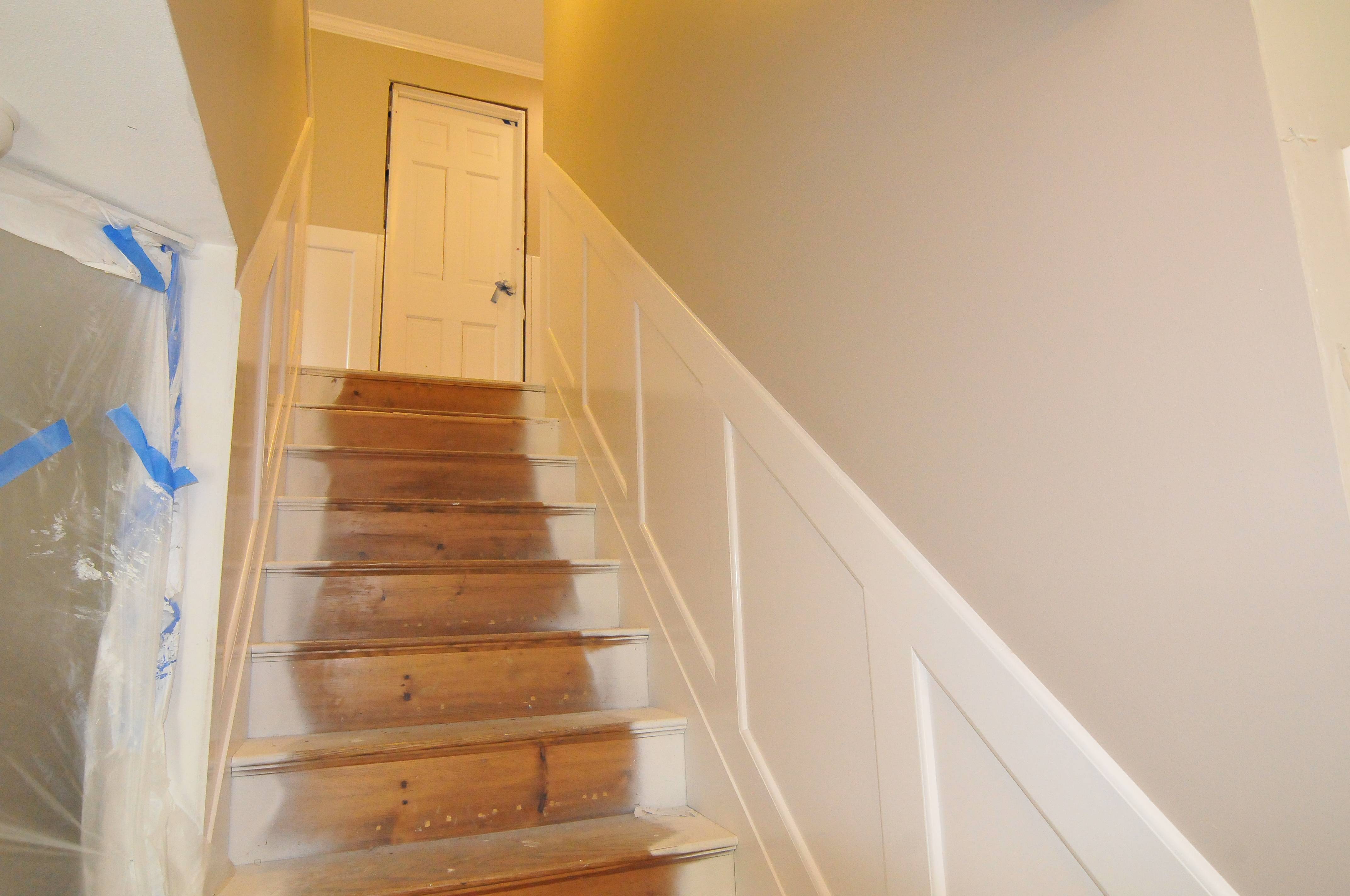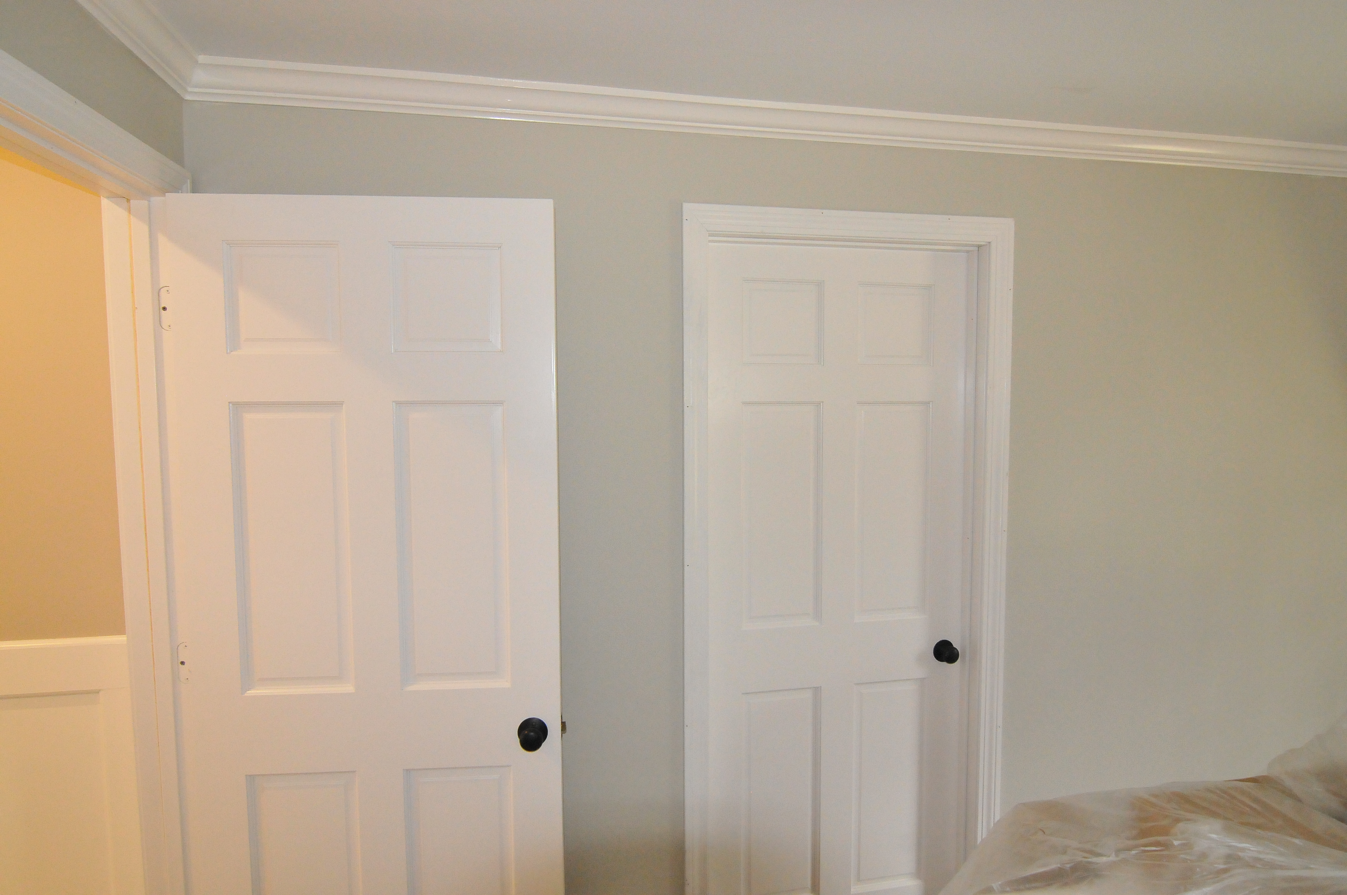 The hallway looks nice with the new paint and the crown molding. We should be able to install the new light fixture tomorrow.