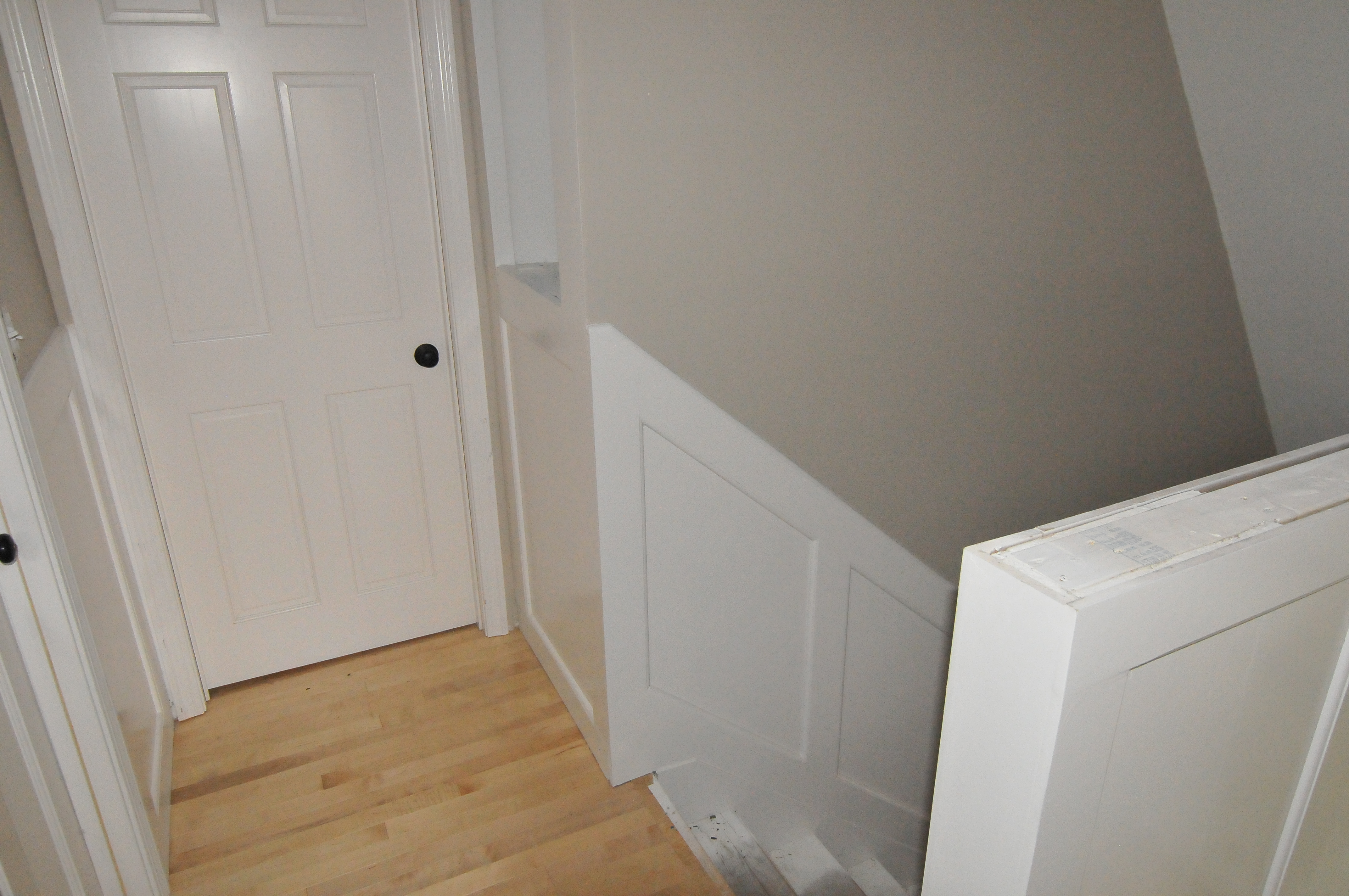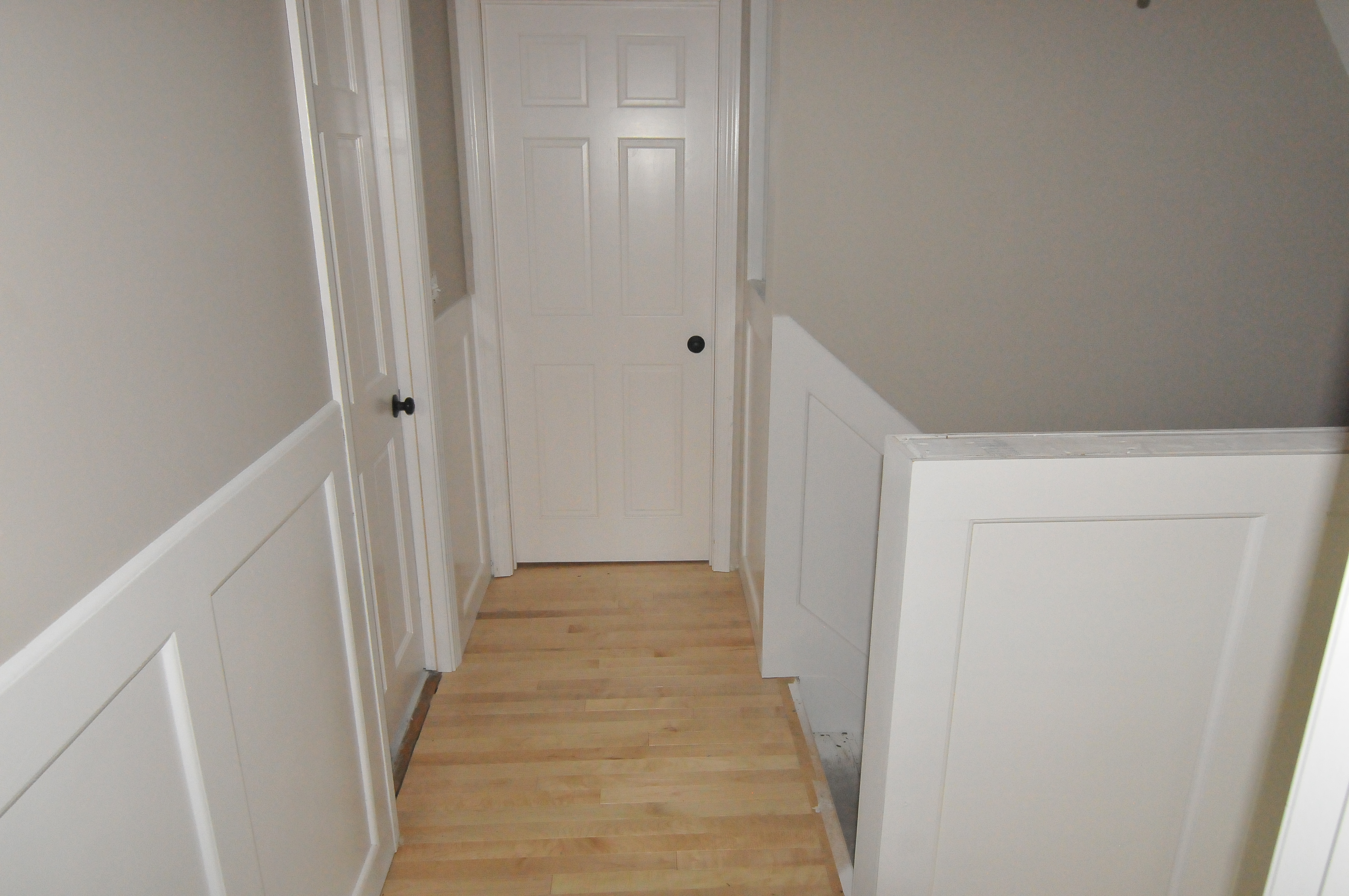 This is the first time we can see the new floors, the new wood work, doors and paint together. This is the hallway at the top of the stairs.