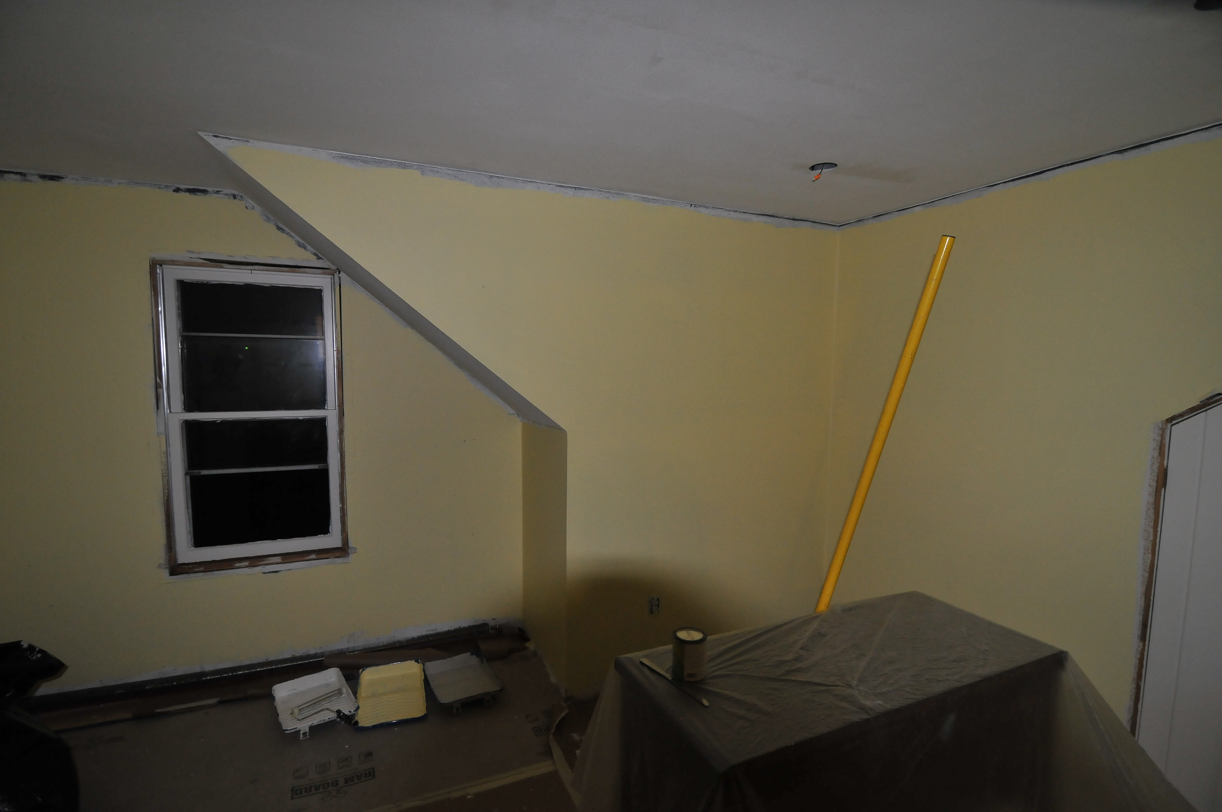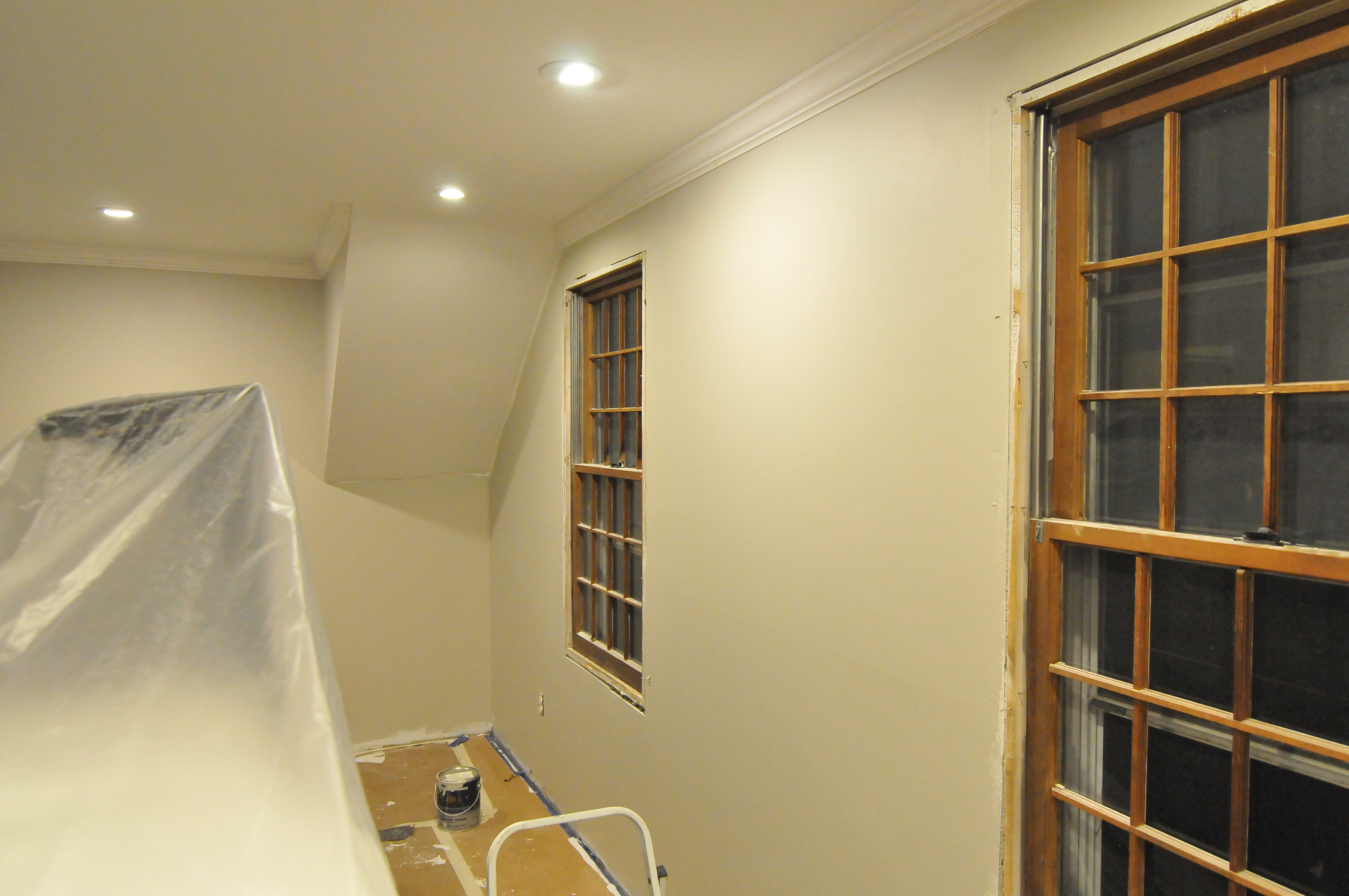 The crown moldings look perfect (or will when painted the final coat) and truly bring the room up a few notches.